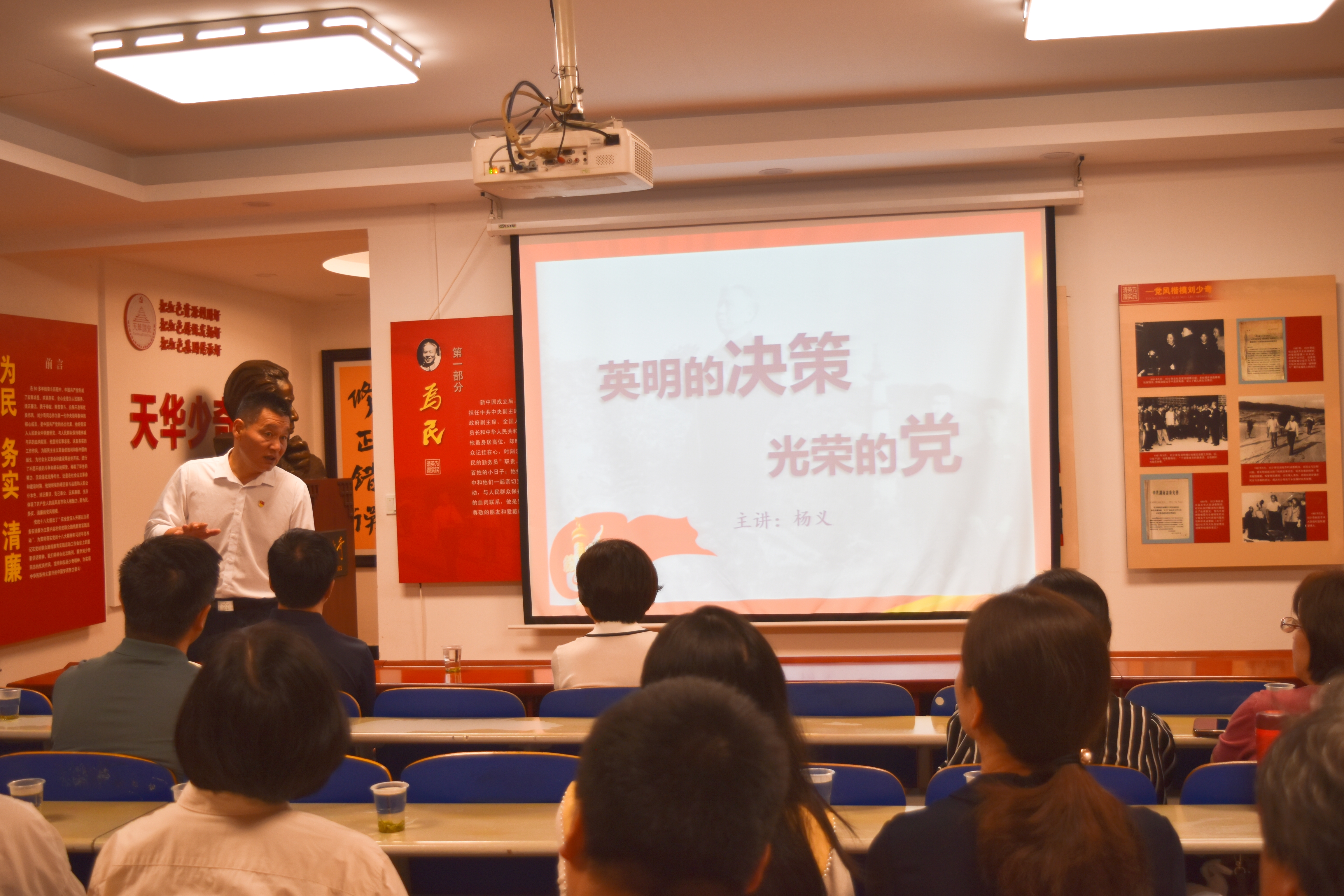 随后,纪念馆馆长杨义同志给大家上了一堂以《英明的决策,光荣的党》为主题的党课,声情并茂地还原了刘少奇在天华村蹲点调研18天的点滴细节,再现了原天华大队党总支书记段树成同志对党忠诚、实事求是的作风。